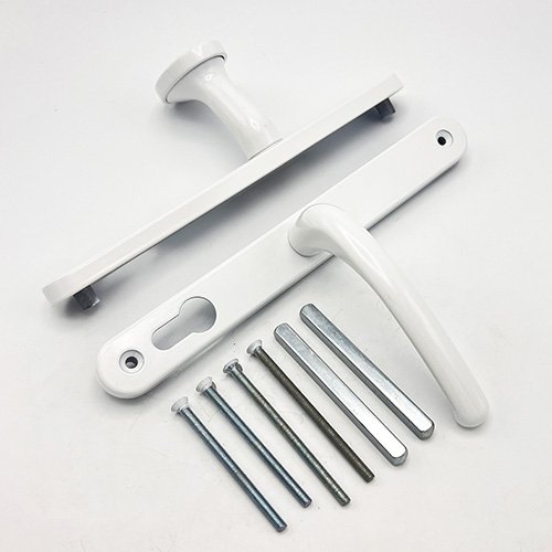 They are supplied as a pair complete with fixings consisting of 2 spindles and 2 pairs of colour co-ordinated screws of differing lengths to suit various door profiles.
