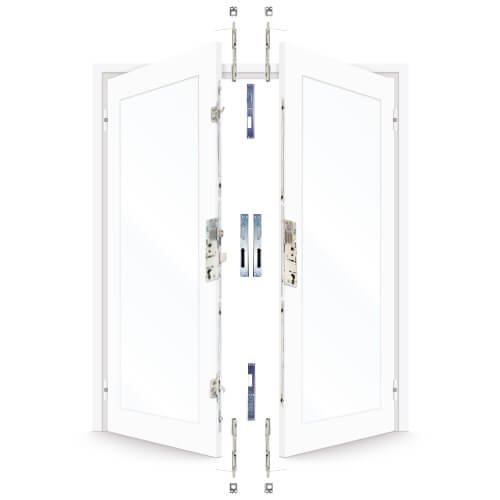 This ERA french door kit features a 2 hook 2 roller master and slave lock with attachments for top and bottom shootbolts. Supplied with a 35mm backset this kit is designed for rebated UPVC doors.
