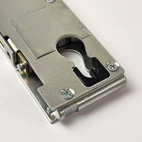 ERA multipoint door lock gearboxes feature a 24mm high latch (with 2 distinctive screws in the latch), a 30mm high deadbolt, and 61mm between them. Gearboxes are held onto the faceplate with 4 screws, which is unusual for a multipoint door lock. The first screw hole to the second measures 37mm, the second to the third measures 85mm, and the third to the fourth screw measures 43mm.