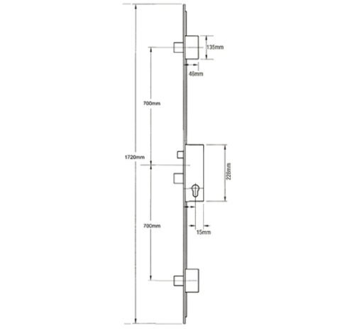 Crimebeater gearboxes measure 227mm high by the backset + 15mm. These gearboxes feature a deadbolt and latch. The latch is 24mm hight, the deadbolt is 30mm high and the distance from the bottom of the latch to the top of the deadbolt is 72mm.