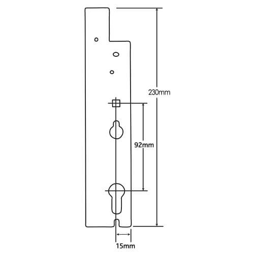 Fullex XL gearboxes are available in 35mm and 45mm backsets in single, double, and split spindle configurations but their dimensions are all the same. They measure 227mm high by the backset + 15mm. These gearboxes attach to their strips with three equidistant screws. The middle screw is 108mm from the top, which is also 108mm from the bottom screw.