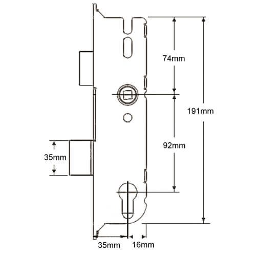 GU multipoint lock gearboxes feature a latch and deadbolt and measure 191mm high (excluding the fixing lugs) by the backset + 16mm wide. The latch is 32mm high, the deadbolt measures 35mm high and there is 54mm from the bottom of the latch to the top of the deadbolt.