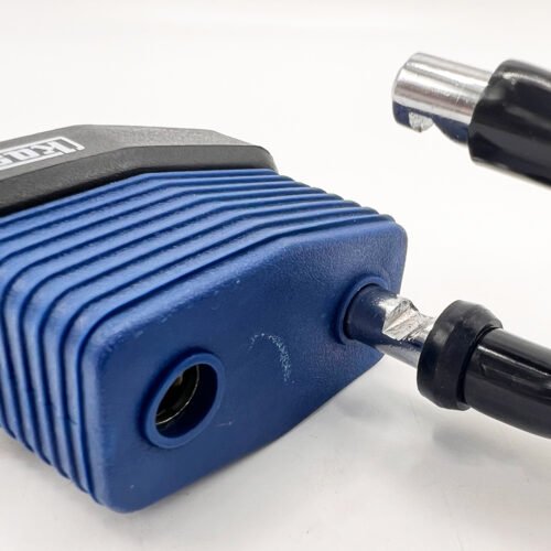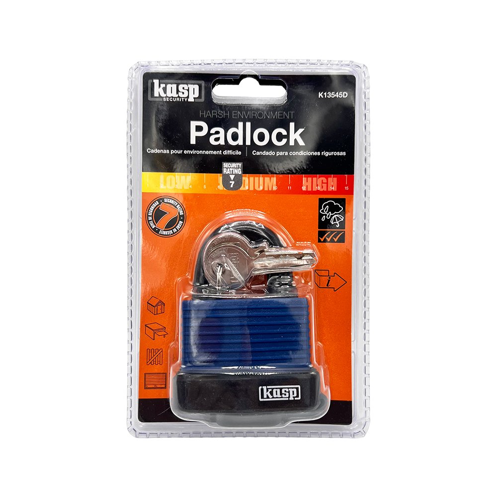 Designed for use in extreme weather conditions, the robust Kasp 135 series features a tough laminated steel body and chrome-plated hardened steel shackle, totally encased by an impact-resistant, weatherproof vinyl jacket. The durable 5-pin anti-pick cylinder is protected from dirt and moisture by a dust cap.