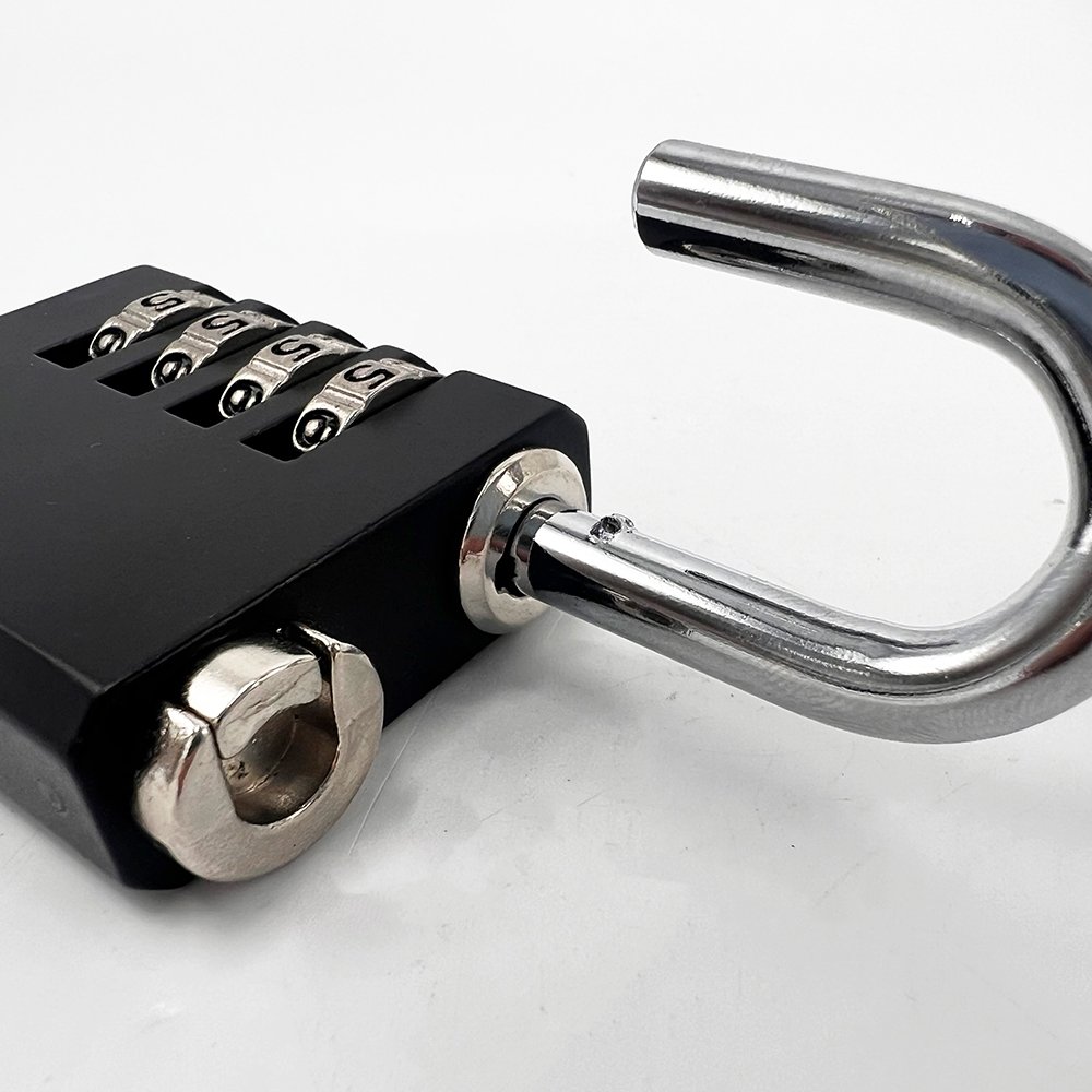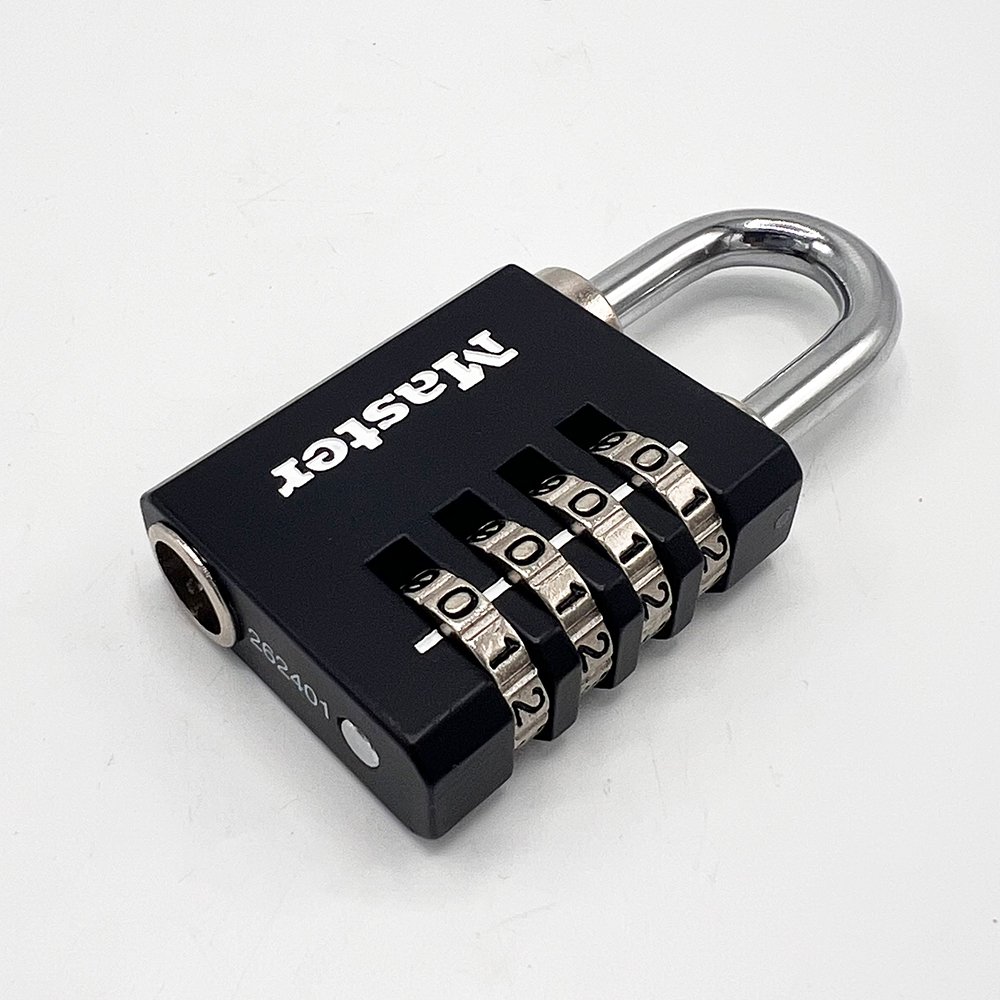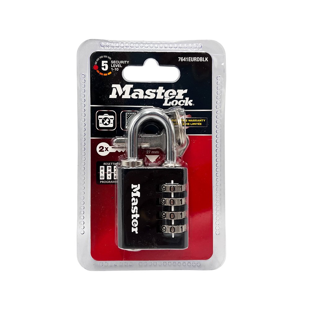 The Master Lock No. 7641EURDBLK Set-Your-Own Combination Padlock with override key features a 40mm wide solid zinc body for durability with a black painted finish. The 6mm diameter shackle is 27mm long and made of nickel-plated steel, offering resistance to cutting and sawing.