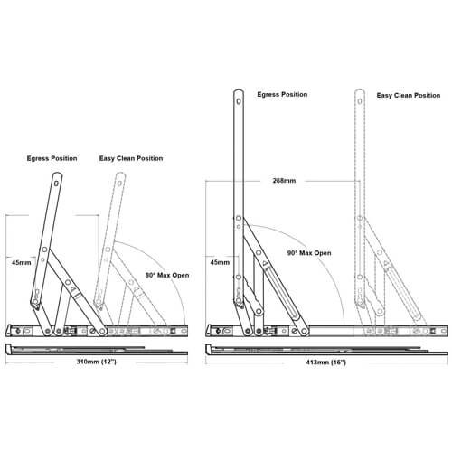 These friction stays enable casement windows to satisfy the BS EN 13126-6 emergency egress requirements whilst also enabling the sash to be moved to the opposite side of the frame for an easy clean function.