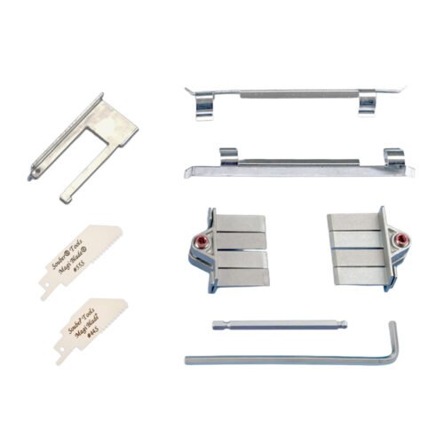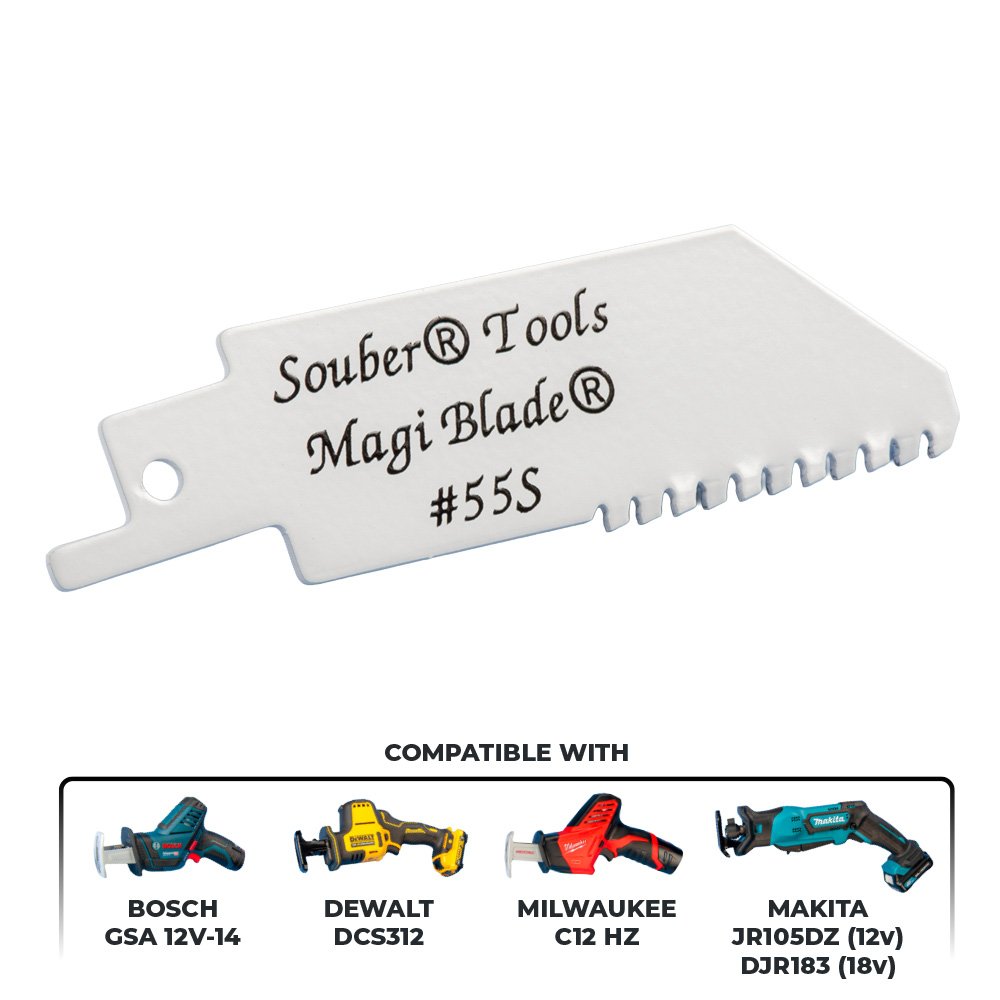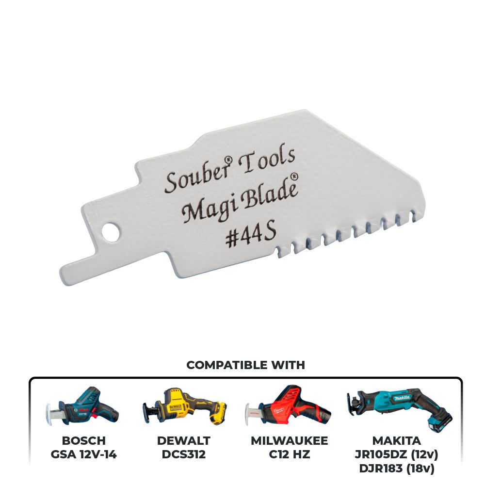 This kit requires the use of a 12 volt compact reciprocating saw; *Magi Blades® should only be used with one of the recommended machines (Bosch GSA 12V-14, Dewalt DCS312, Mkita JR105DZ (12V), Makita DJR183 (18V), Milwaukee C12 HZ) with a 3Ah battery – fully charged – and ideally, a spare.