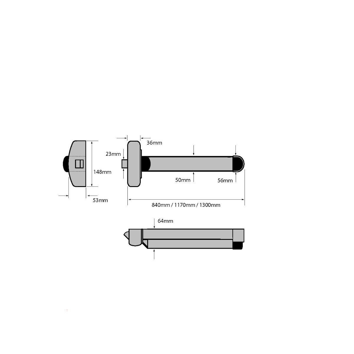Standard size – 840mm suitable for doors upto 860mm wide, longer versions – 1170mm and 1300mm for wider doors are available. Supplied with strikers for timber or metal doors as standard – strikers for PVCu available separately