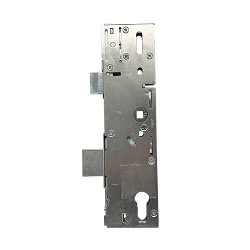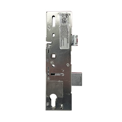Surelock multipoint door lock gearboxes feature a 24mm high latch (with 2 distinctive screws in the latch), a 30mm high deadbolt, and 61mm between them. Gearboxes are held on to the faceplate with 4 screws, which is unusual for a multipoint door lock. The first screw hole to the second measures 37mm, the second to the third measures 85mm, and the third to the fourth screw measures 43mm.