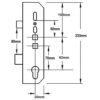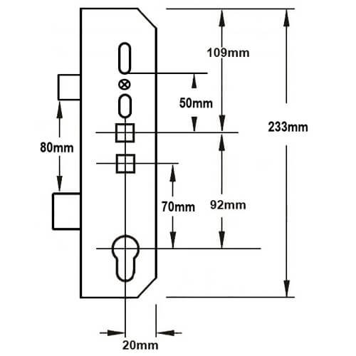 The case measures 233mm high by the backset + 20mm wide. The latch measures 20mm high, the deadbolt is 30mm high and there is 80mm between the bottom of the latch and the top of the deadbolt.