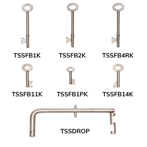 The TSS fire brigade key set includes: 3 x rim keys (FB1, FB2, FB4), 3 x padlock keys (FB1, FB11, FB14) and 1 x lift drop key.