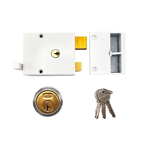 The Union 1332 Drawback Lock has a 60mm backset and feature an alternative way of retracting the latch. Instead of a round or winged rotating thumbturn, the 1332 utilises a sprung trigger like lever that directly connects to the latch bolt to allow it to be retracted by pulling the lever back away from the case like a trigger.